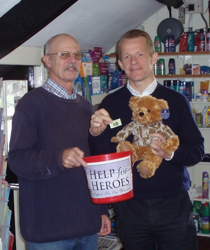 The “Help for Heroes” fundraiser at East Chinnock P.O. with the draw for Hero the Bear by Mr David Laws M.P., seen below with Rodney Lee
