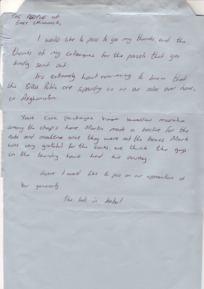 Your efforts and those of your village have a profound effect on all the men and women working out here in Afghanistan. Receiving gifts makes life that little bit easier, and gives the inevitable routine of day to day life here a little more flavour. Perhaps more importantly, these packages confirm that we are in the thoughts of people back home, and that support should never be underestimated in its ability to heighten moral.
